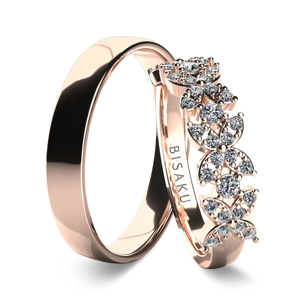 Jedním slovem dechberoucí design dámského prstenu, který evokuje rozkvetlé květiny. Strhující hra dokonale zpracovaných detailů a drobných kamenů upoutá na první pohled. Pánský prsten svojí elegancí a velmi pohodlným profilem zaujme nejednoho budoucího ženicha. Případně lze zvolit pánský prsten z kteréhokoliv jiného páru.