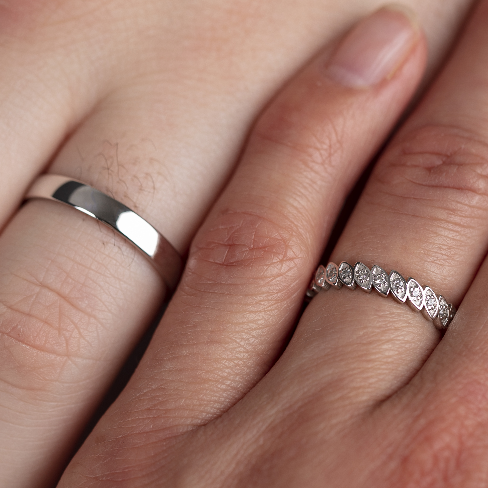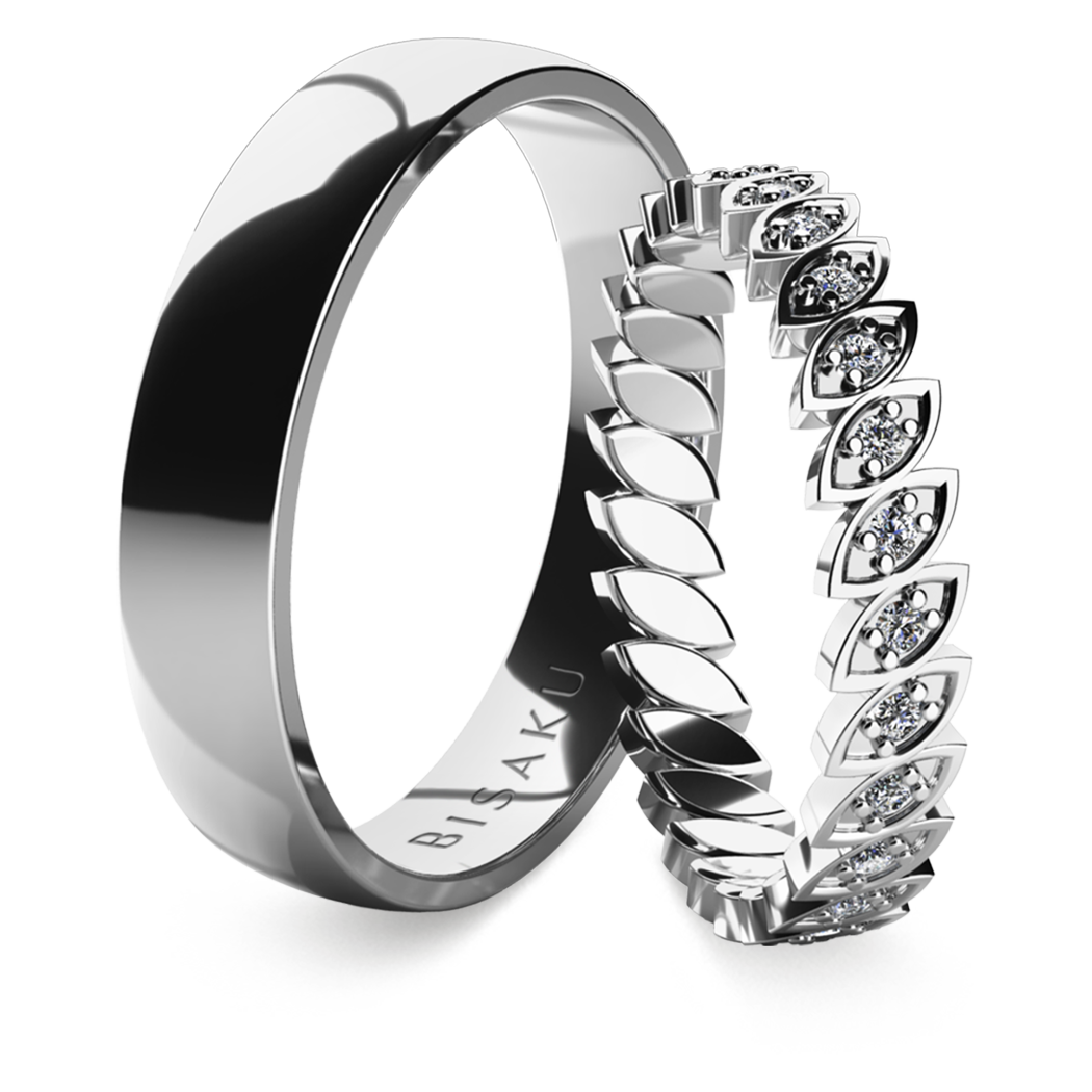 Příroda je nekonečnou inspirací, florální motiv se přenesl v podobě lístečků i do dámského prstenu Mavia. Doplňuje jej pánský jednoduchý prsten ve šíři 3,5mm.