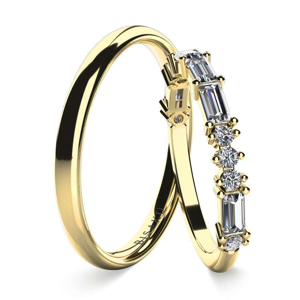 Dámský prsten Alara zdobí střídání kulatých a bagetových kamenů, které společně vytvářejí harmonickou kompozici. Pánský prsten je v čistém, hladkém provedení a jeho šířku lze libovolně měnit.