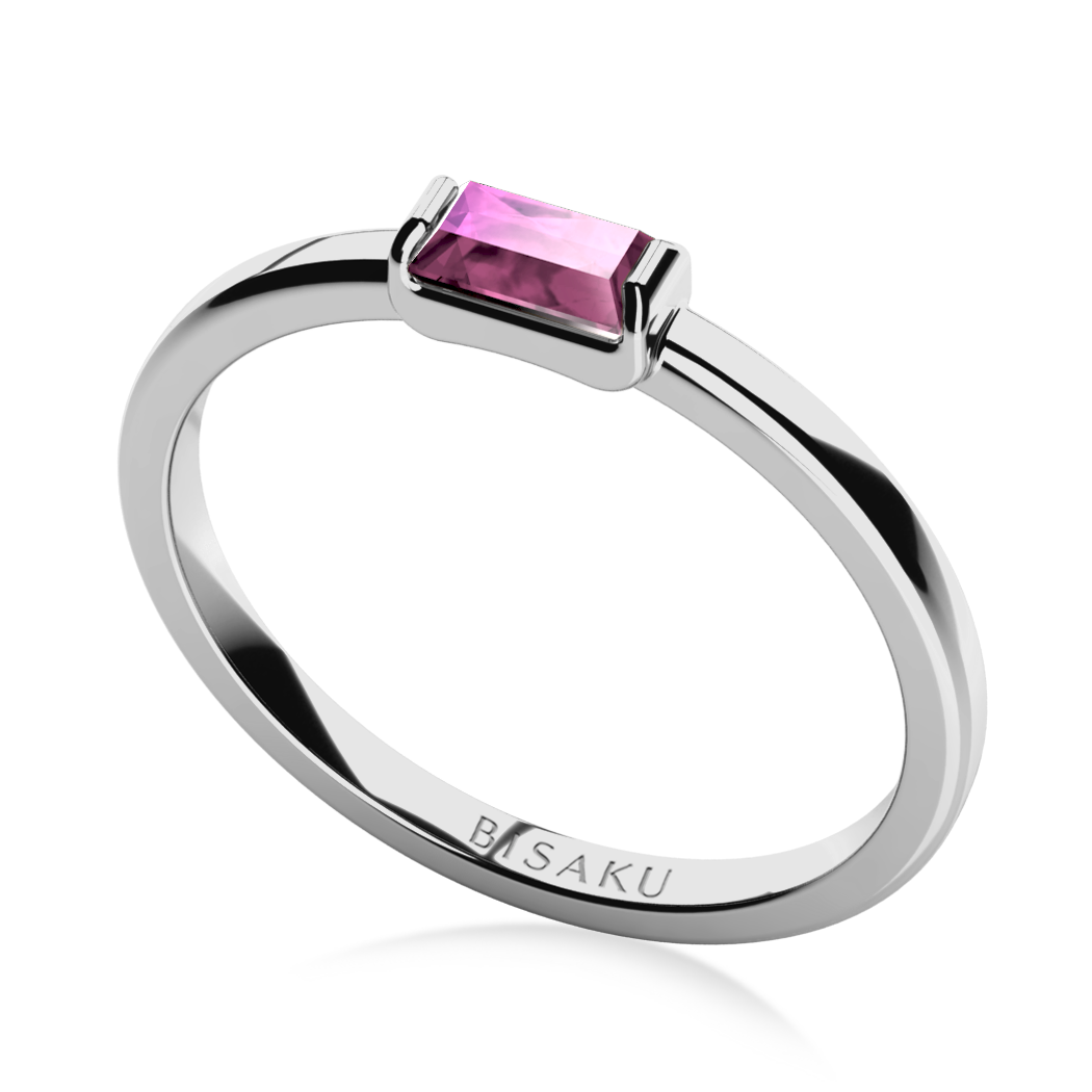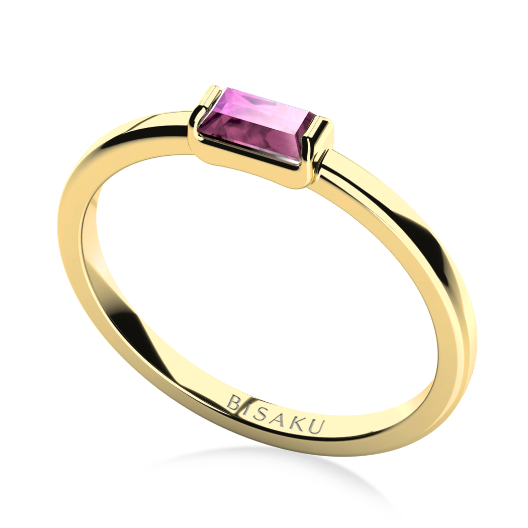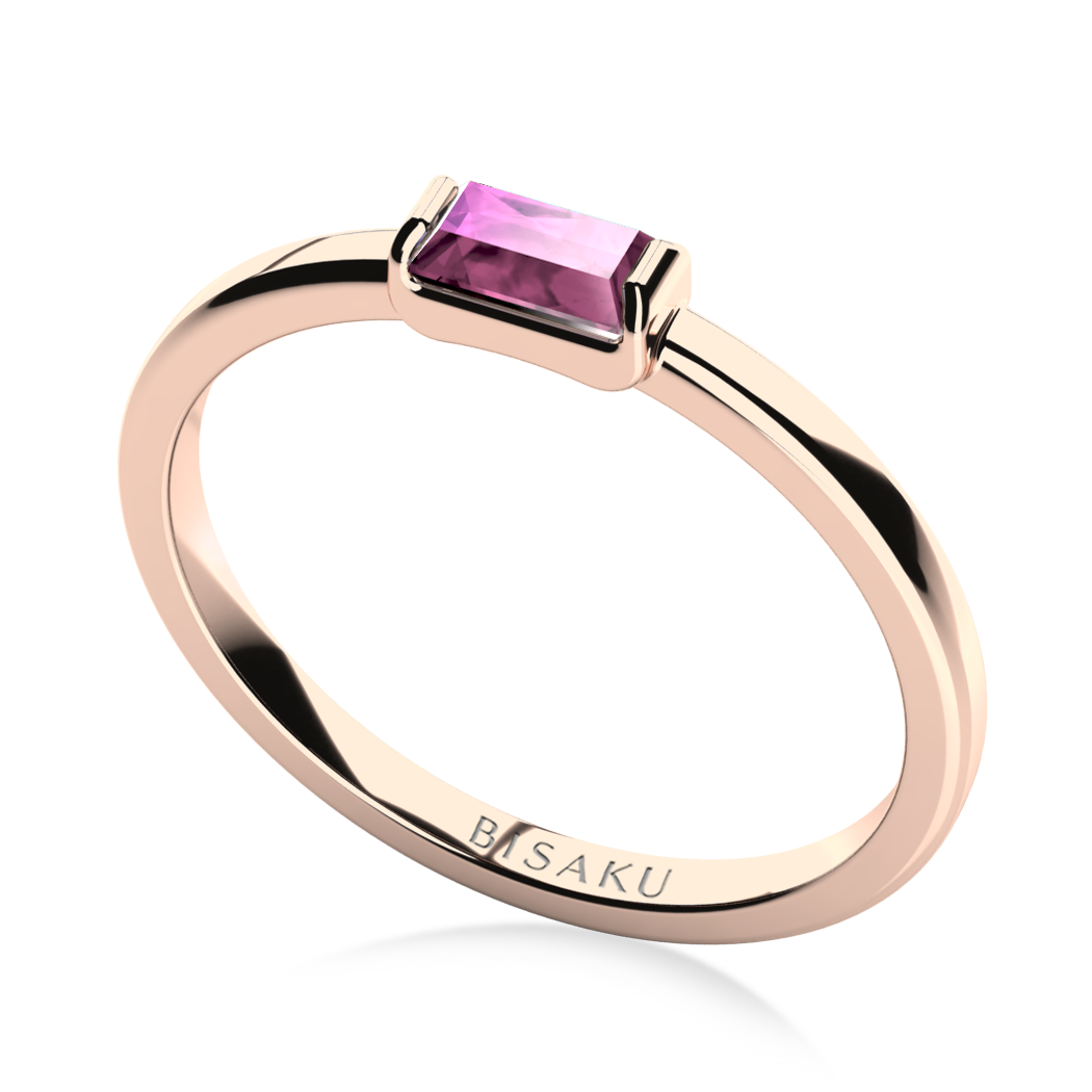Jemný prsten s růžovým safírem brusu bageta vyniká čistými liniemi a vyváženým designem. Decentní alternativa k modelu Diane s diamanty na obroučce. Ideální pro ty, kteří hledají jednoduchost. Uveďte prosím do poznámky barvu zlata, o kterou máte zájem. (S124/2)