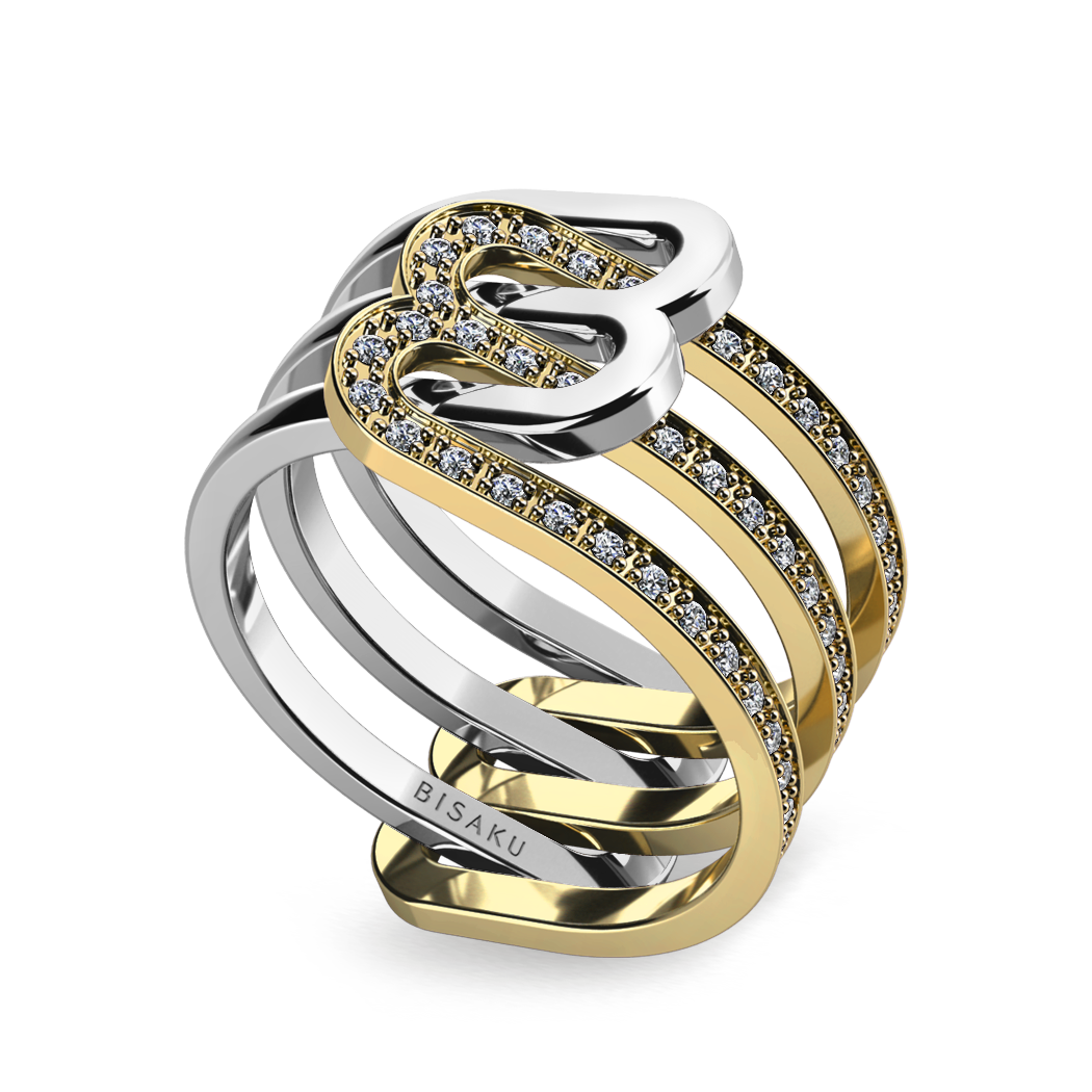 Unikátní design prstenu B není viditelný na první pohled. Prsten se skládá ze dvou samostatných částí, které do sebe zapadají a vytváří písmeno B na obou stranách. Stylový hlavolam který zaujme. Uveďte prosím do poznámky velikost prstenu a barvu zlata, o kterou máte zájem. (S42/3)