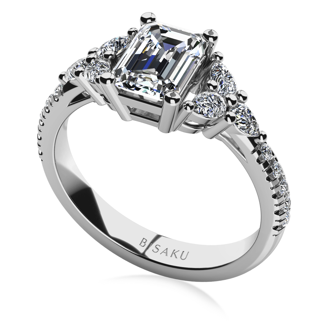 Tento zásnubní prsten jsme navrhli s důrazem na originalitu a jemné detaily. Dominantou je centrální diamant ve výbrusu emerald cut, který zaujme svým čistým, geometrickým tvarem. Z každé strany jej doplňují netradičně zasazené pear cut diamanty, které prstenu dodávají nevšední charakter. Celý design dotváří drobné diamanty v šíně, které podtrhují celkovou harmonii prstenu.