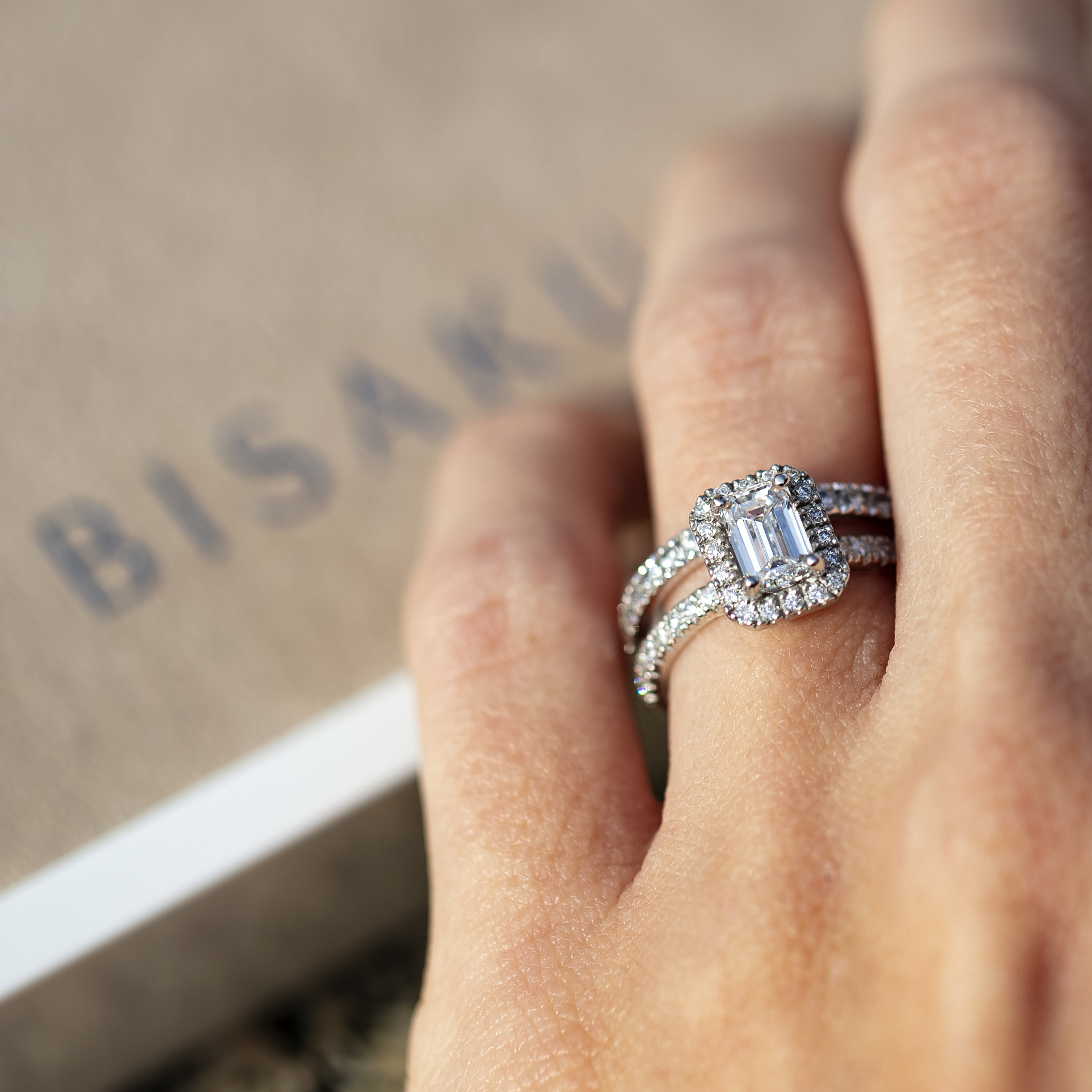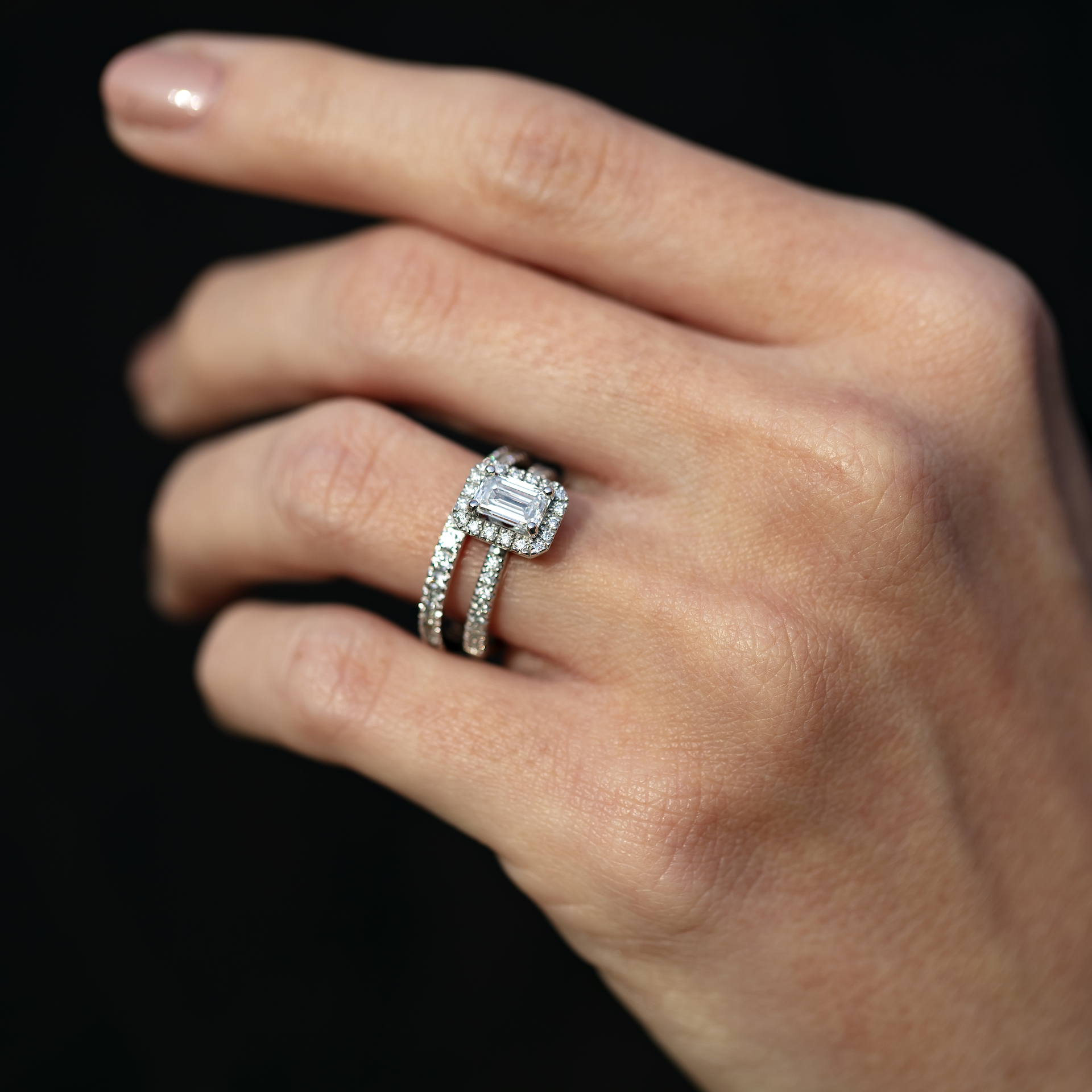 Zamilujte se do diamantů nebo moissanitů v brusu emerald spolu s námi! Jeho výjimečnost podtrhují třpytivé kameny, které lemují jak centrální kámen, tak obroučku šperku.